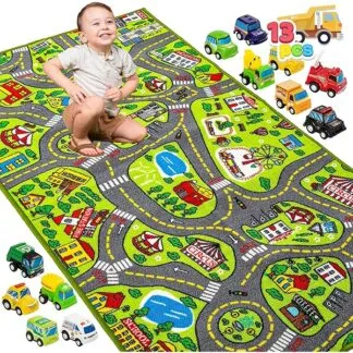 JOYIN Kids Play Rugs – 12 Pull-Back Vehicle Set – Durable Carpet Playmat Rug – City Pretend Play – Toddler Car Track Rug