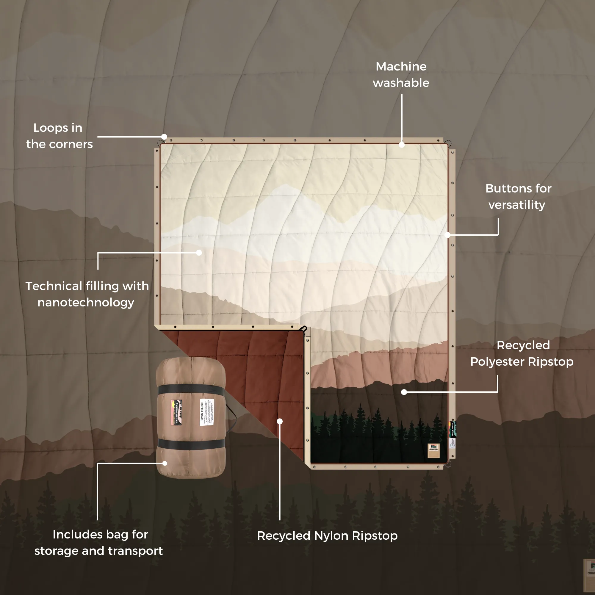 · Buttons to use it as a poncho, sleeping bag or connect them together